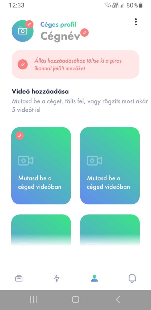 - Legalább 1 videót fel kell töltened a profilodhoz, ennek maximális hossza 30 másodperc lehet. Ha ennél több időt szeretnél szánni a céged és a pozíció bemutatására, több videót is feltölthetsz (összesen 5 videó lehet a profilodban), ezeket a jelentkezők folyamatosan fogják látni, egymás után lejátszva.